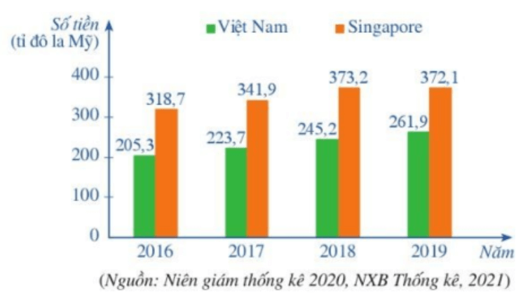 Hình vẽ sau từ câu 12 đến câu 13 Hình vẽ là biểu đồ về tổng sản phẩm Quốc nội (GDP) của Việt Nam và Singapore từ năm 2016 đến 2019 (đơn vị tỷ USD) Việt Nam ứng với hình màu xanh Singapore ứng với hình màu đỏ |